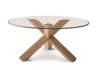 Questo tavolo, disegnato dall’architetto Mario Bellini nel 1976, ha una base semplice e scultorea, un incrocio diagonale di tre gambe a sezione quadrata, che consente l’appoggio del piano di Ø 165 cm (nella versione con piano in legno e cristallo) o di Ø 160 cm (nella versione con piano in marmo). La base in legno è caratterizzata da incastri solidi, ricavati direttamente dal massello, massima espressione della capacità di lavorare il legno di Cassina.