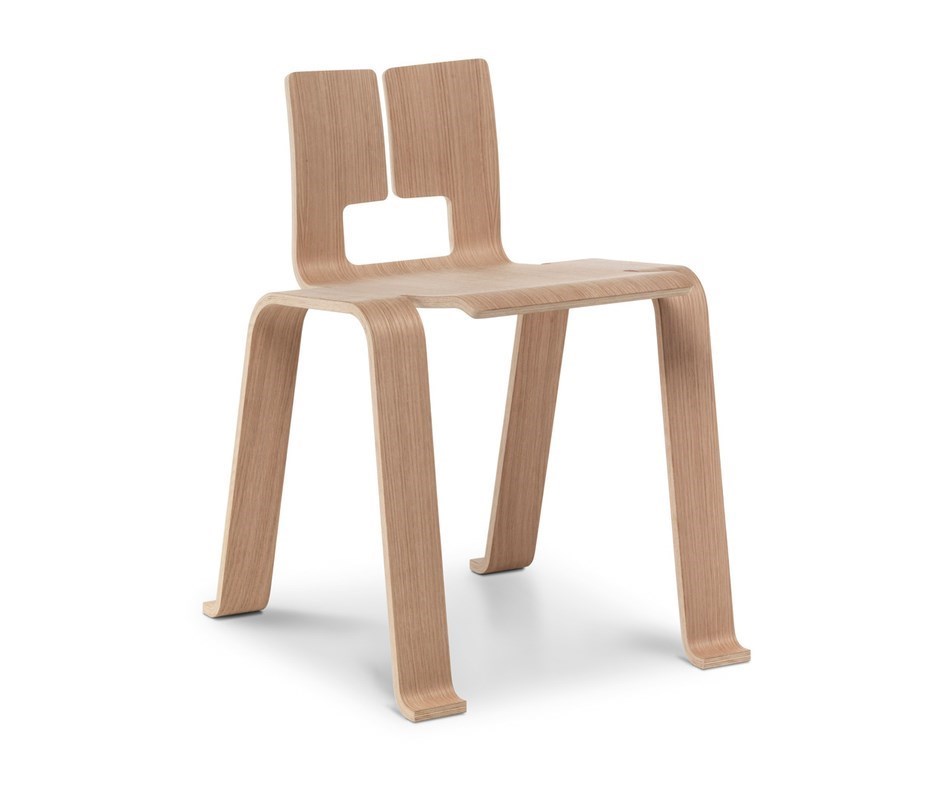 Sedia leggera modellata, con minime piegature, da un solo pezzo stampato di compensato curvo di rovere naturale o tinto nero. Per la delicatezza della struttura si consiglia di limitare l’utilizzo del prodotto in ambito domestico.