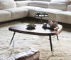 Tavolino basso con gambe in metallo con finitura canna di fucile o nero opaco e piedini di appoggio a terra in materiale plastico. I piani di forma triangolare con angoli arrotondati sono disponibili in legno massello di noce canaletto naturale, rovere naturale, rovere tinto nero oppure in legno laccato opaco o lucido.