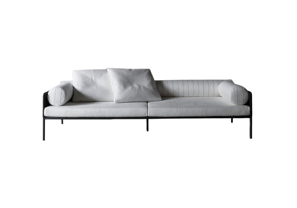 Divano da interno e da esterno, sia nella versione “Light” solo struttura, oppure con intreccio nei materiali a catalogo. Versione indoor: struttura in tubolare d’acciaio Ø25mm verniciato con polveri epossidiche grigio canna di fucile. Incordatura a campiture piene, trama e ordito, in corda di cellulosa nelle finiture a collezione. Telaio sedile, avvitato alla struttura, in tubolare d’acciaio sezione 40×30mm, verniciato con polveri epossidiche e cinghiato con molleggio a nastri elastici in caucciù rivestito; imbottitura in poliuretano espanso rivestita con una foderina realizzata con polietere 100% accoppiato con supporto di vellutino poliammidico termofissato. Cuscini di seduta in poliuretano espanso a densità differenziata e cuscini a rullo per schienali e braccioli in poliuretano espanso, rivestiti con falde di fibre acriliche. Rivestimento in pelle o tessuto, entrambi interamente sfoderabili tramite cerniere e velcro a strappo. Versione outdoor: struttura in tubolare Ø25mm di acciaio Inox AISI 316 satinato opaco oppure in acciaio Inox AISI 316 verniciato e finito con polveri epossidiche poliestere grigio canna di fucile. Intreccio in corda cerata (Ø5mm) nelle finiture a collezione. Telaio sedile, avvitato alla struttura, in tubolare d’acciaio Inox sezione 40×30mm, cinghiato con molleggio a nastri elastici in caucciù rivestito con ganci in acciaio Inox. Imbottitura in schiuma poliuretanica a cellula aperta DRYFEEL S rivestita con tessuto drenante per esterno. Cuscini di seduta e cuscini a rullo per schienali e braccioli in schiuma poliuretanica a cellula aperta DRYFEEL S e falde di fibra per esterno, rivestita con una foderina in tessuto idrorepellente termosaldato. Rivestimento in tessuto per esterni interamente sfoderabile tramite cerniere e velcro a strappo. Appoggio a terra garantito da piedini in PVC nero.