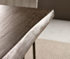 Il piano di questo tavolo moderno in massello di rovere carbon o naturale è smussato irregolarmente mentre il telaio, in ferro pieno, è curvato e rastremato dalla struttura a traliccio.