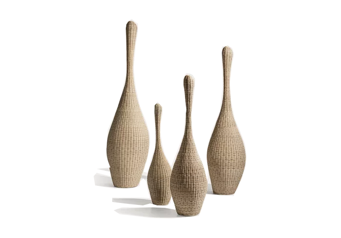 Famiglia di lampade interamente realizzate in midollino intrecciato Naturale Mélange o laccato Bianco opaco, Grigio, Nero, Oceano, Tortora, Bueberry, Date o Ginger, è caratterizzata da una forma che richiama quella di una bottiglia e da un sapiente gioco di lavorazioni, forme e colori. Risaltano grazie alla bellezza dell’intreccio in fibra naturale unita ad un design originale, che conferiscono al prodotto carattere e unicità. Sono disponibili in diverse dimensioni, dalla S all’XL, un complemento d’arredo che può essere utilizzato singolarmente o in combinazioni per un effetto ancora più suggestivo e scenografico.Dimensioni [cm]:- Ø.31 H.120- Ø.40 H.155- Ø.48 H.190- Ø.56 H.225