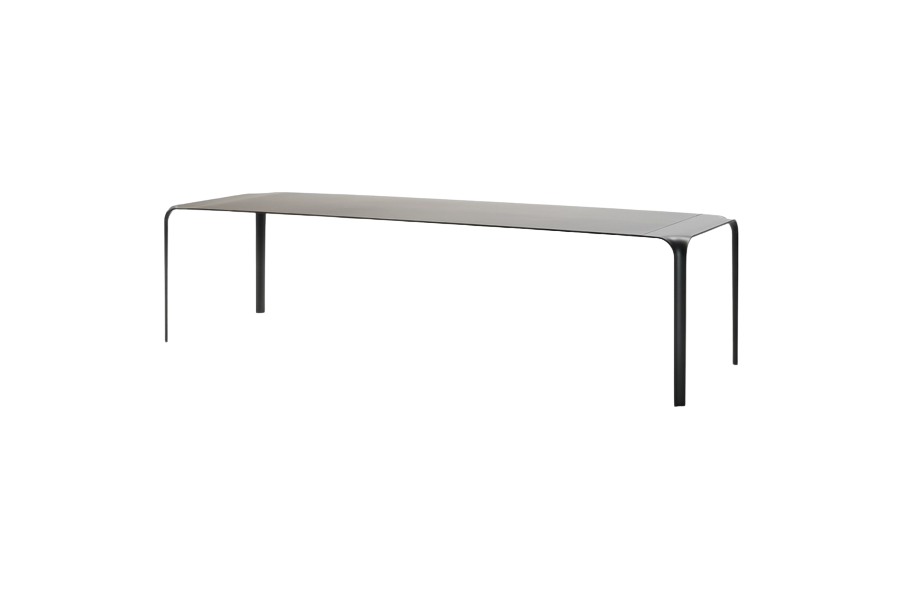 Tavolo composto da gambe in fusione di alluminio ricavate da stampo e piano scatolato in “sandwich” di MDF e lamiera d’alluminio, pressati e incollati tra di loro con annegati profilati in acciaio per garantire stabilità e struttura. Finitura con vernice a liquido colore nero opaco, oppure “effetto cemento” nella versione col. Chiaro e col. Scuro. Piano disponibile anche impiallacciato nelle essenze Stone Oak® o rovere tinto carbone,oppure in tranciato di legno multilaminare Striped Grey con gambe in finitura “effetto cemento” col. Scuro. Appoggio a terra garantito da piedini in materiale plastico.