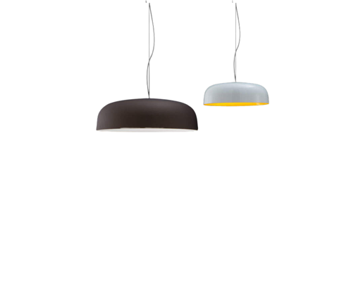 Lampada a sospensione a luce fluorescente indiretta. Riflettore e schermo paraluce in metallo verniciato, anche bicolore. Finiture: bianco esterno-bianco interno / bianco esterno-giallo interno / bronze esterno-bianco interno. Possibilità di finiture colore personalizzate, per quantità superiori alla decina.