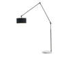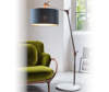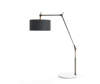 Lampada da terra con struttura tubolare in ottone bronzato spazzolato con snodo in massello di noce canaletta e base in marmo di Carrara. Paralume in cotone grigio con interno dorato.