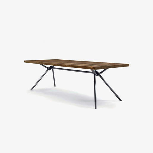 Tavolo composto da top in legno massello a liste incollate con bordi naturali o squadrati, abbinato ad una base essenziale e lineare formata da un tubolare intrecciato in ferro vuoto. Disponibile a richiesta in tubolare intrecciato in ferro pieno.
