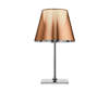 Lampada da tavolo a luce diffusa. Base, supporto asta e supporto diffusore in lega di Zama pressofusa lucidata. Copertura della base in PA (nylon) stampato di colore nero ad iniezione. Diffusore interno in PC (policarbonato) stampato ad iniezione di colore opalino. I diffusori esterni sono disponibili nelle versioni: trasparente o fumè realizzati in PMMA (polimetilmetacrilato), e metallizzato grigio o bronzo sulla superficie interna utilizzando un processo di alluminatura sottovuoto oppure in vetro trasparente.