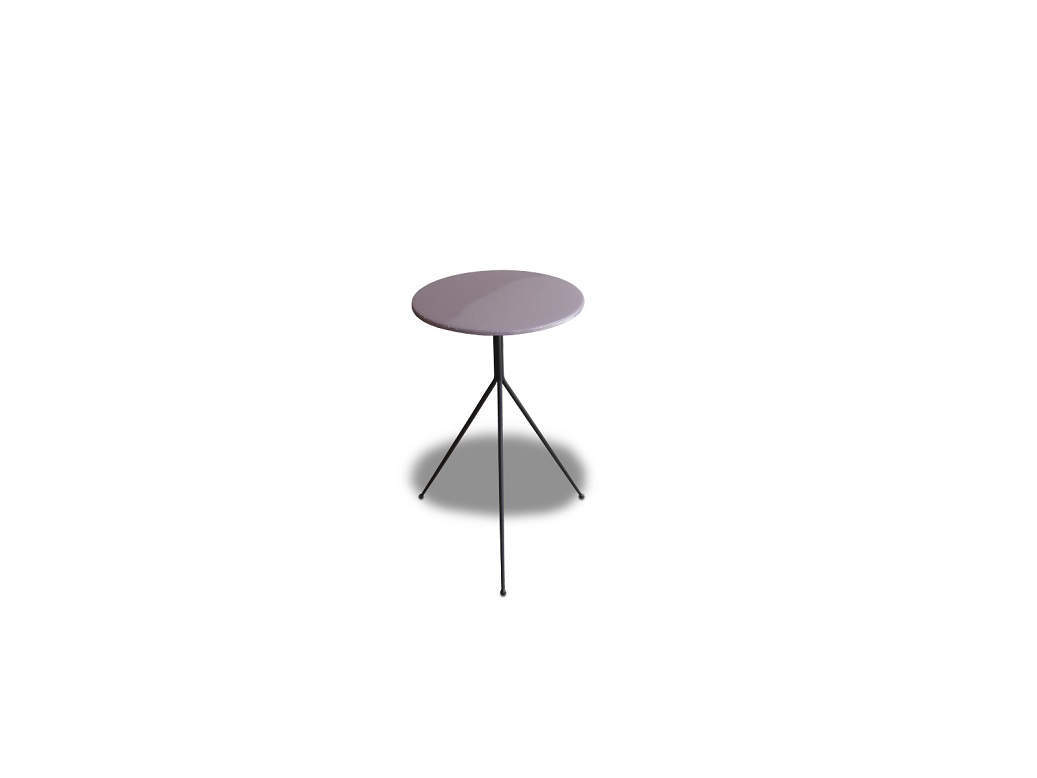Base in metallo verniciato nero opaco. Piano smussato in MDF spessore 1,9 cm, ¾" decorato a mano con resine spalmate in nuance secondo l’estro dell’artista e laccato lucido.Dimensioni [cm]: Ø.33 x H.53Piano: in resina color Lilla