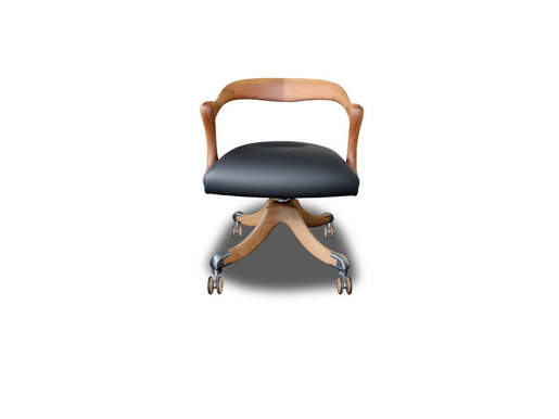 Il sedile è in multistrato di pioppo imbottito e rivestito in pelle.La base, in massello di noce americano, è a quattro razze con piedini in ottone girevoli.