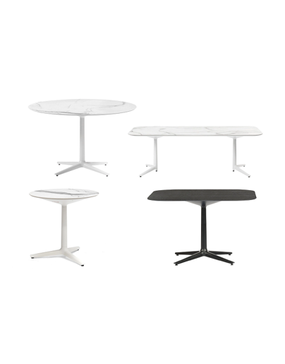 Multiplo è un’ampia famiglia di tavoli, trasversale nei suoi impieghi, e pensata per consentire la personalizzazione giocando sulle forme (quadrata stondata, tonda e ovale) e l’abbinamento di basi (base centrale, a due, tre o quattro razze) e piani (in gres tinta unita o finitura marmo e vetro).