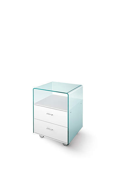 Rialto, di Fiam, è una cassettiera dal design semplice ma originale grazie alla struttura di vetro che si raccorda con la cassettiera. In vetro curvato trasparente da 8 mm. La struttura dei cassetti è in legno laccato bianco. La cassettiera è provvista di 2 cassetti con sistema di chiusura automatica soft. Ruote e maniglie cromate.