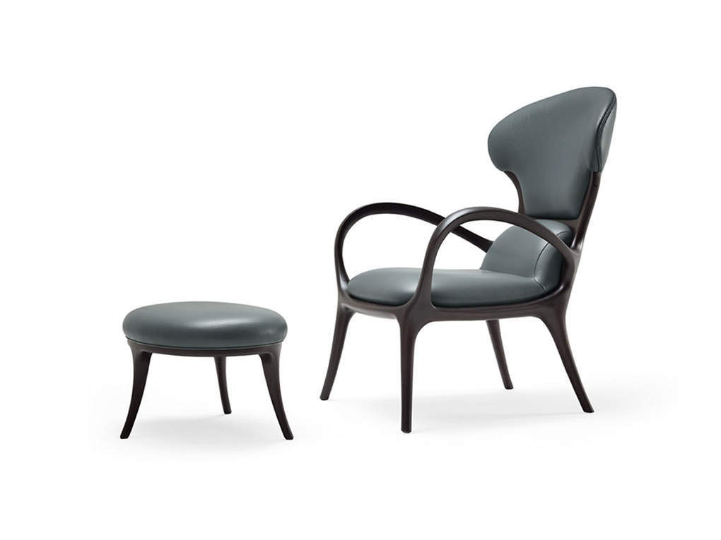 Poltrona e pouf realizzati in massello di noce americano, seduta e poggiatesta in multistrato curvato, imbottiti.