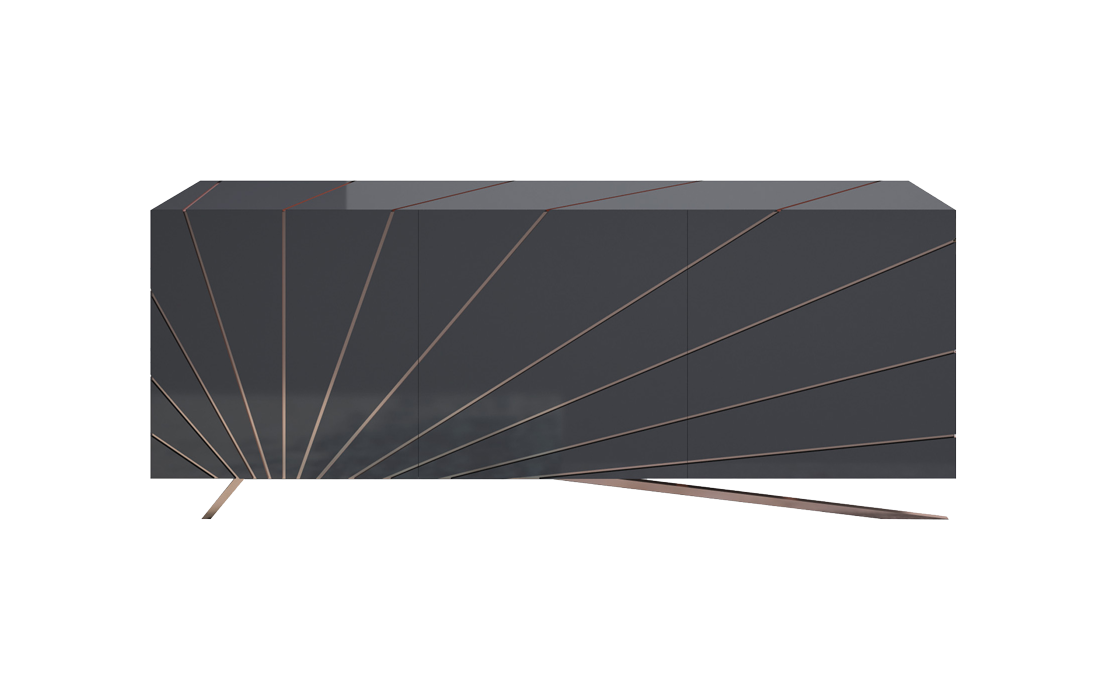 Ante, top e fianchi con taglio a 45 gradi. Apertura push-pull. Ripiani interni in cristallo trasparente. Disponibile in grafite RAL 7024 laccato lucido o opaco ed incisioni oro rosa. Disponibile nelle finiture: colori RAL opachi o lucidi. Ripiani interni in cristallo.