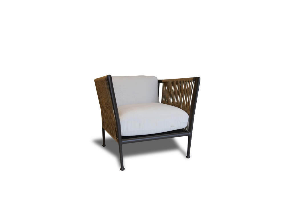Struttura in alluminio, colore bronzo, rivestimento in corda poliolefina intrecciata a mano di colore beige melange.Dimensioni [cm]: L.86 P.81 H.77